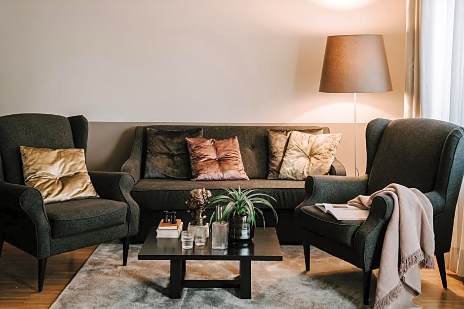 Modern apartment offering a TV, seating area and kitchenette.