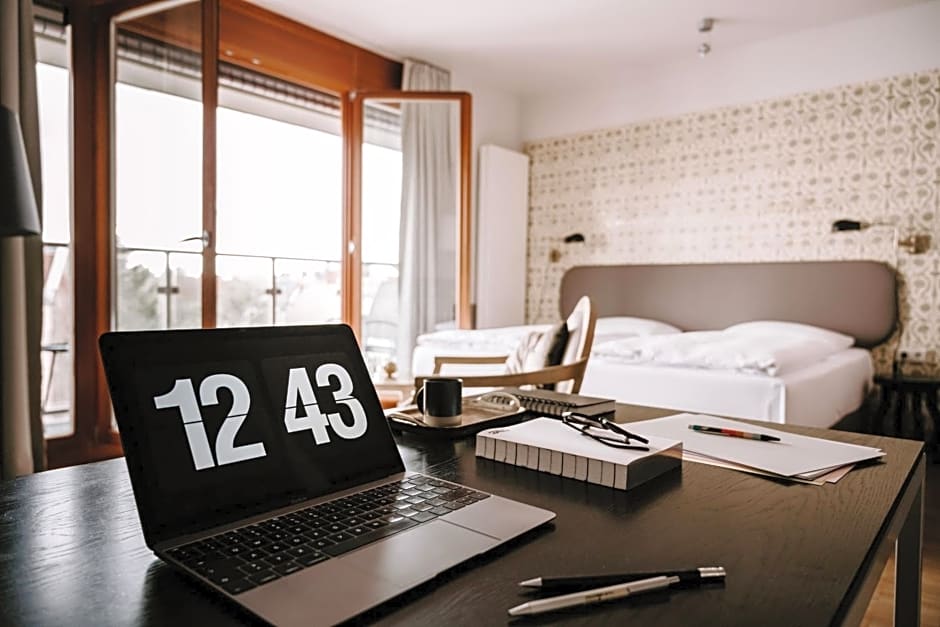 This spacious studio features a modern bathroom with a spa shower. It faces Goethe Street.